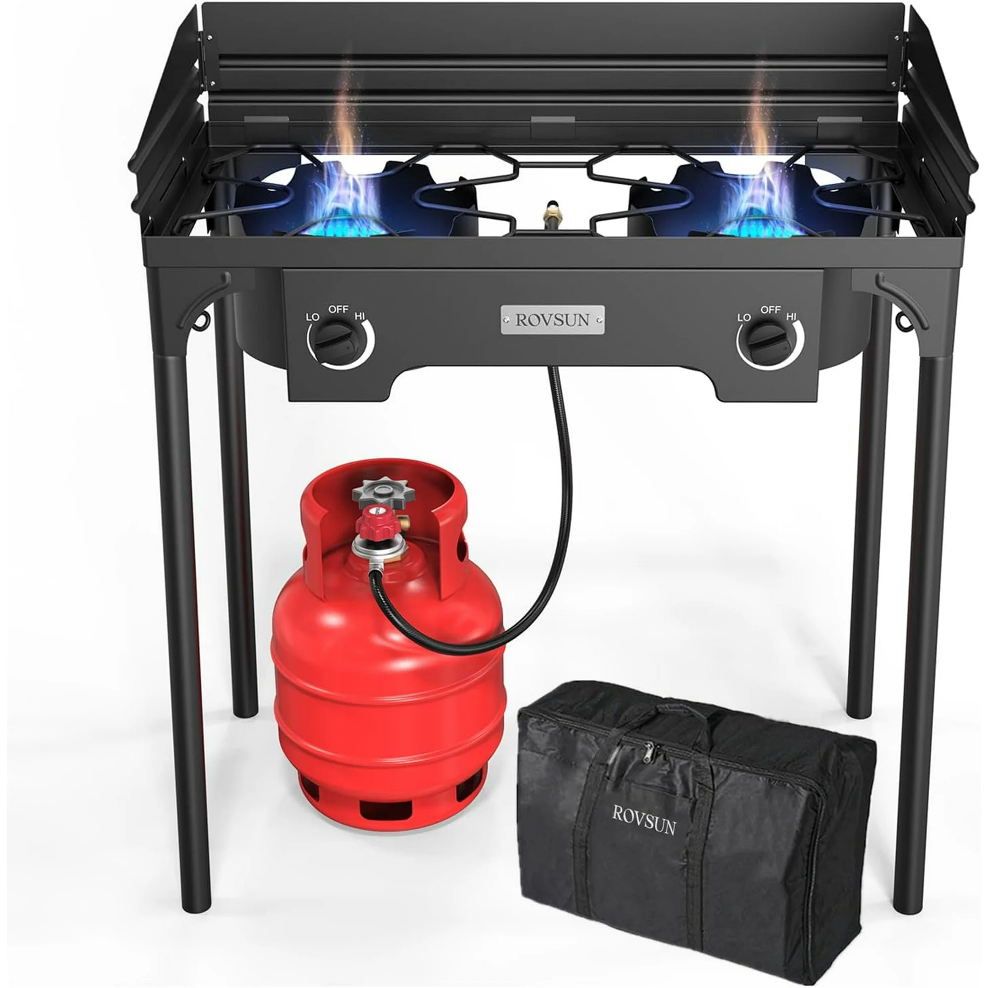 ZHENYING 2 Burner Outdoor Propane Gas Stove with Windpanel, Carrying Bag & Regulator, 150,000 BTU Stand Cooker for Backyard Cooking Camping Home Brewing Canning Turkey Frying