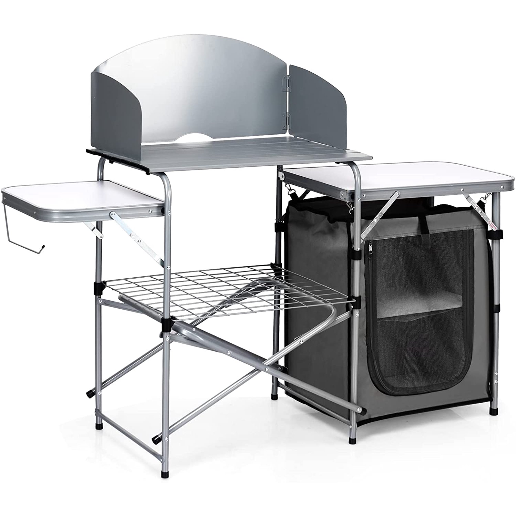 ZHENYING Folding Camping Kitchen Table, Aluminum Portable Camping Grill Table with Windscreen, Cook Station, Outdoor Quick Set-up Camp Cook Table with Storage Organizer Shelves, Carry Bag