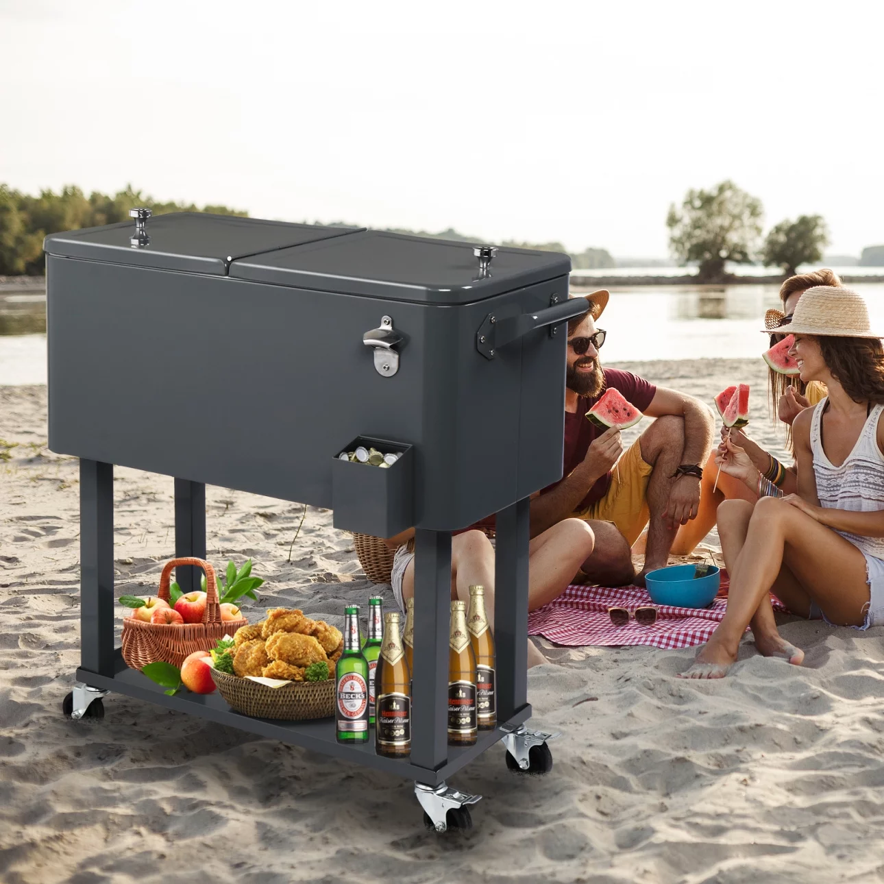 80 Quarts Frozen Insulation Cart Rolling Cooler, Camper Storage Trunk with 2 Normal Casters and 2 Locking Casters, Summer Camp Cart, Frozen Rolling Cart, Keep Cool And Warm, Drink Trunk Drink Cart