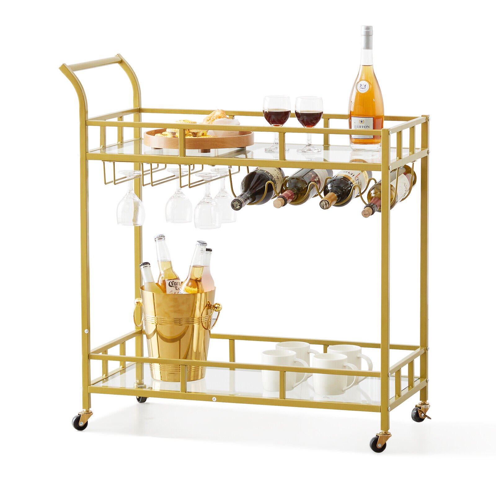 ZGBY 2 Tiers Gold Metal Bar Serving Cart With Wine Rack Glass Holder 120 Lbs