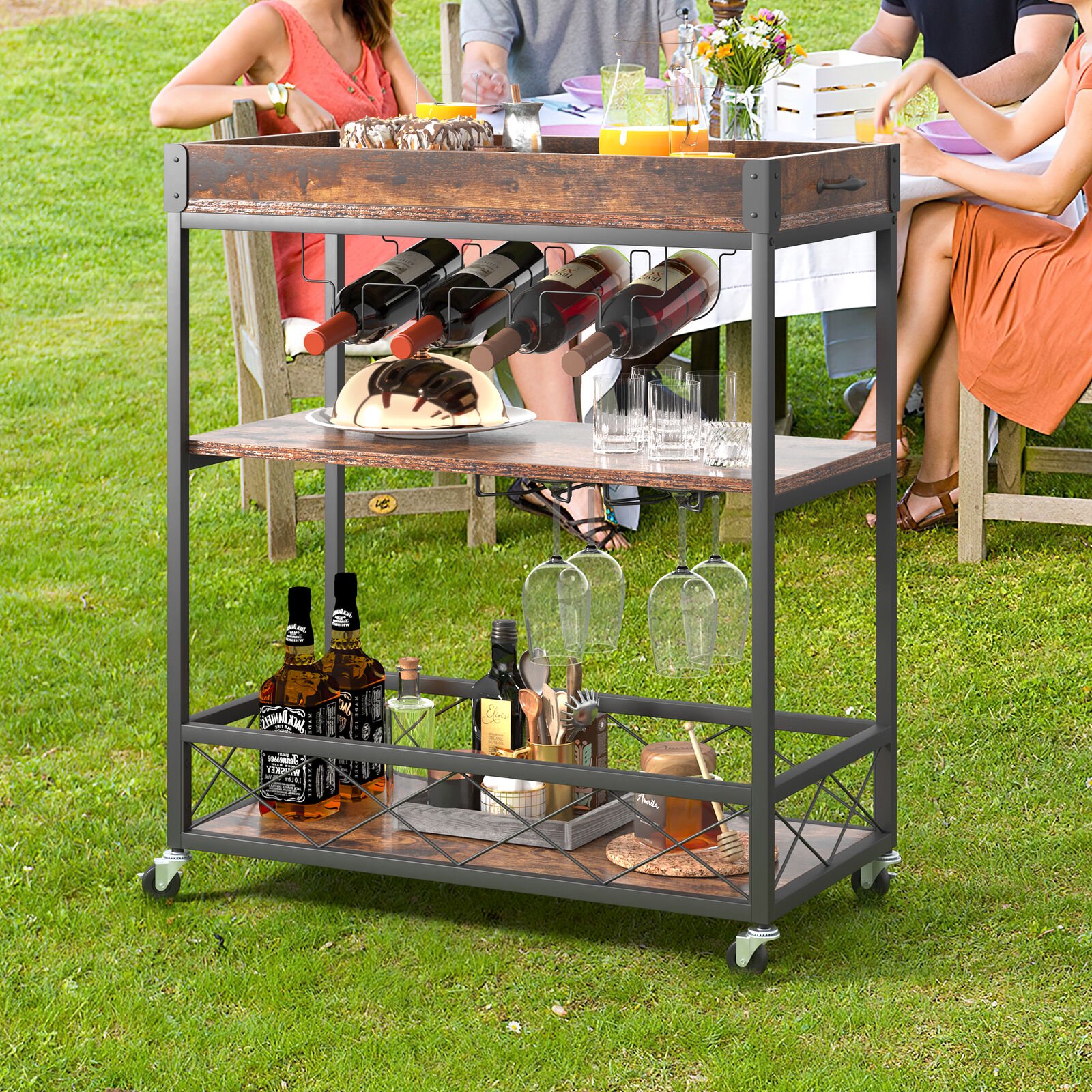 ZGBY 3-Tier Bar Serving Cart Rolling Trolley With Wine Grid Glass Holder 300Lbs