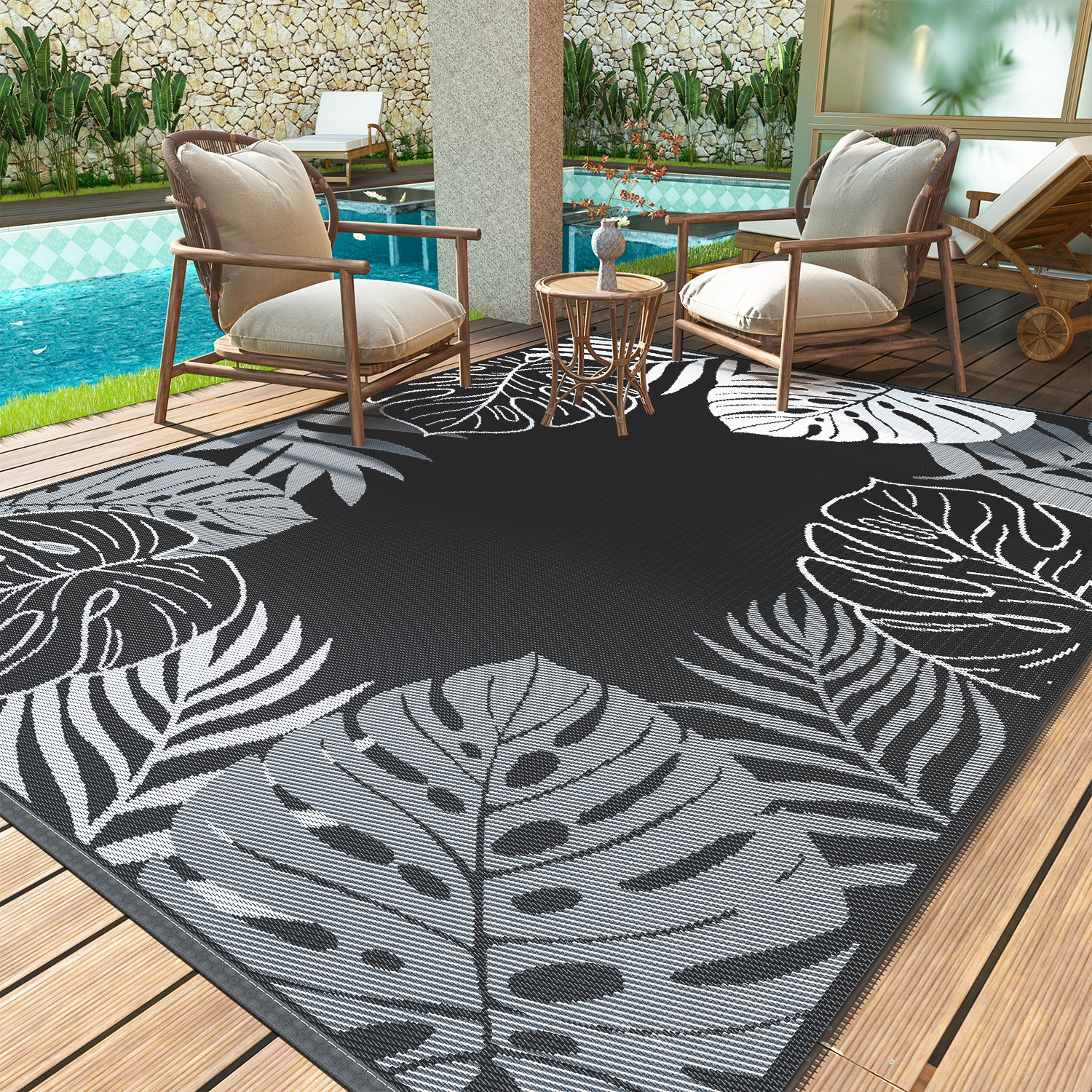 SIXHOME Outdoor Rug Clearance Patio Rug 5x8 Waterproof Outdoor Mats Porch Camping Plastic Area Rugs Black and White Reversible Outside Rug for Picnic RV Balcony Straw Texture Tropical Palm Pattern
