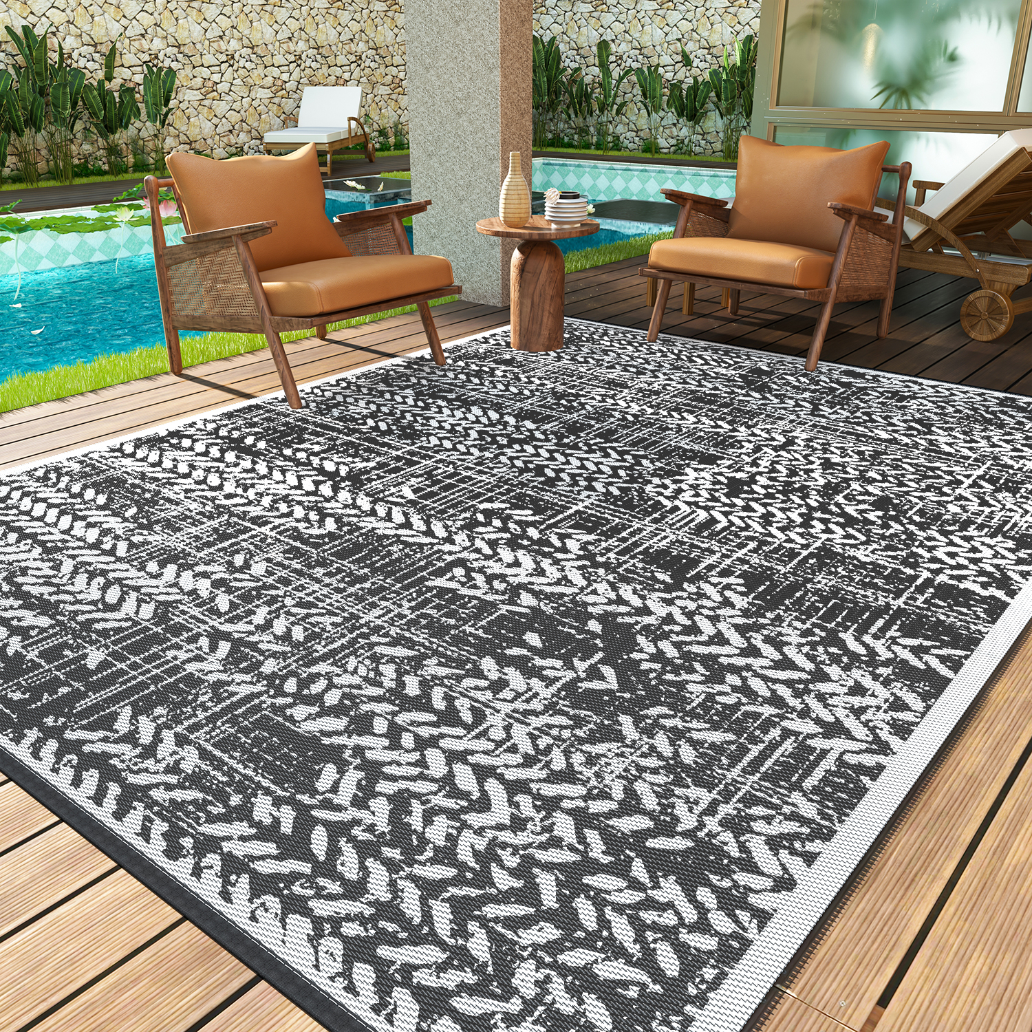 SIXHOME Outdoor Rugs Patio Clearance Waterproof Mat 5x8, Stylish Plastic Straw Reversible Area Rug for Picnic RV Camping Porch Balcony, Black and White