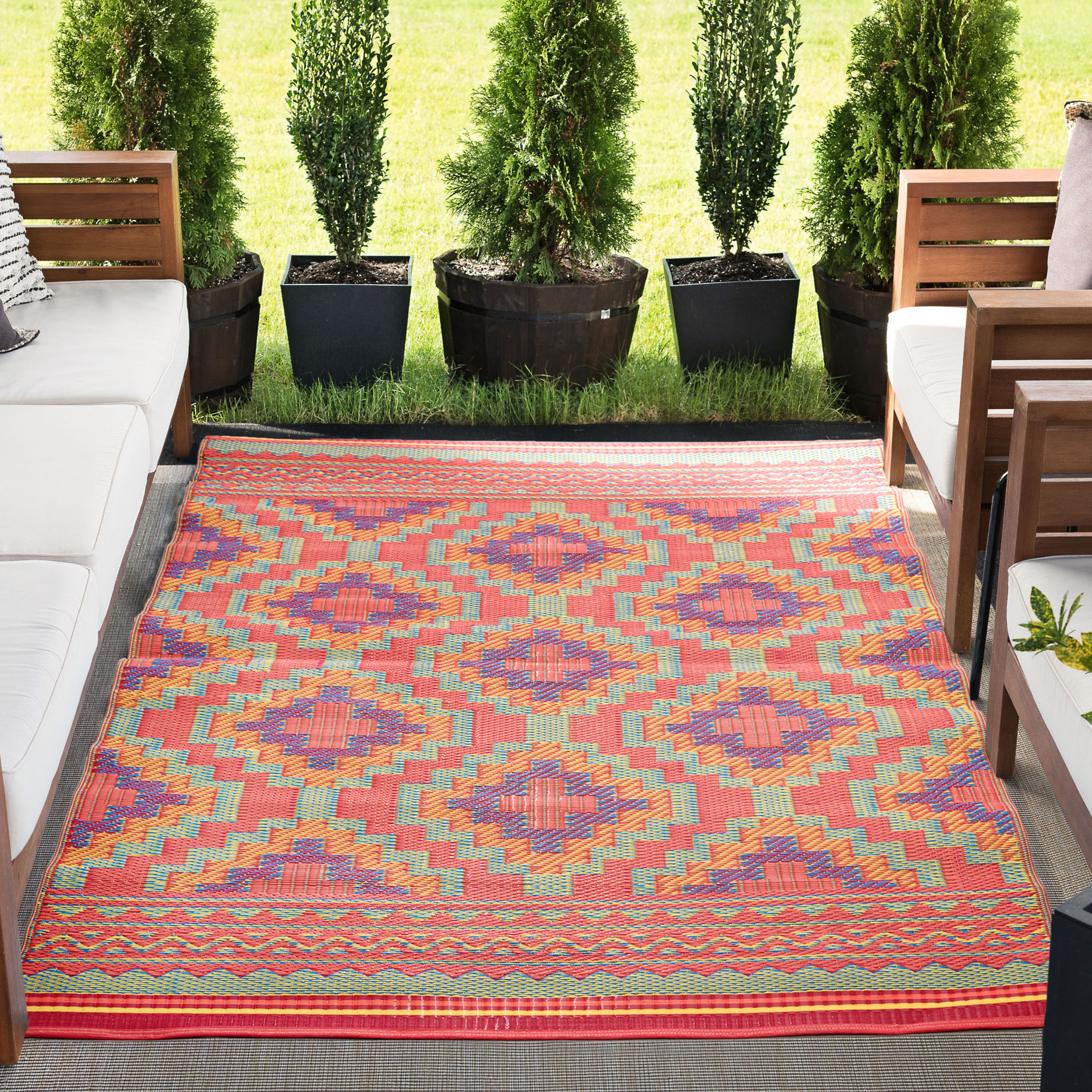 5x7 Waterproof, Reversible Plastic Straw Outdoor Rugs for Patios | Also for Camping, RV, Deck, Porch, Balcony, Camp, Patio | Multi-Color, Geometric | Size: 5' x 6'11''