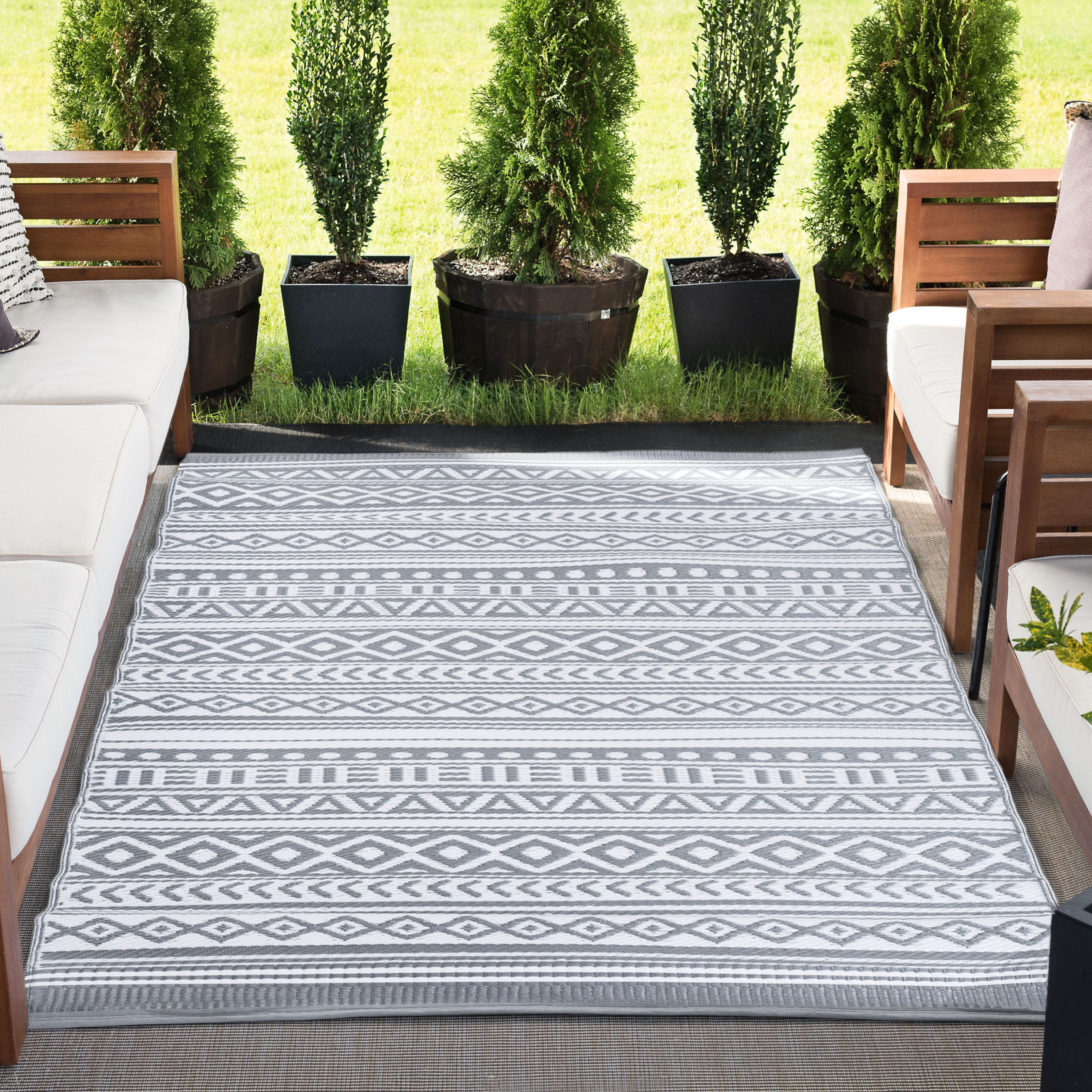 FH Home Outdoor Rug - Waterproof, Fade Resistant, Crease-Free - Premium Recycled Plastic - Geometric - Patio, Deck, Porch, Balcony, Laundry Room - Aztec - Gray & White - 4 x 6 ft