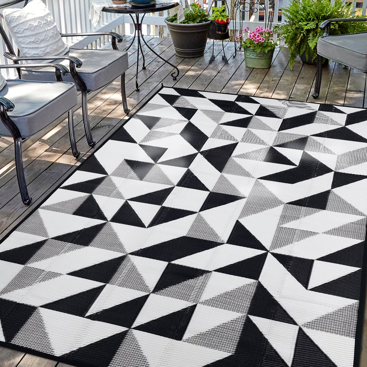 Outdoor Rugs for Patio 6x9ft, Reversible Plastic Straw Rug, RV Camping Waterproof, Portable Carpet Area Rug for Camping, Deck Garden, Porch and Balcony, Black & White, Geometric