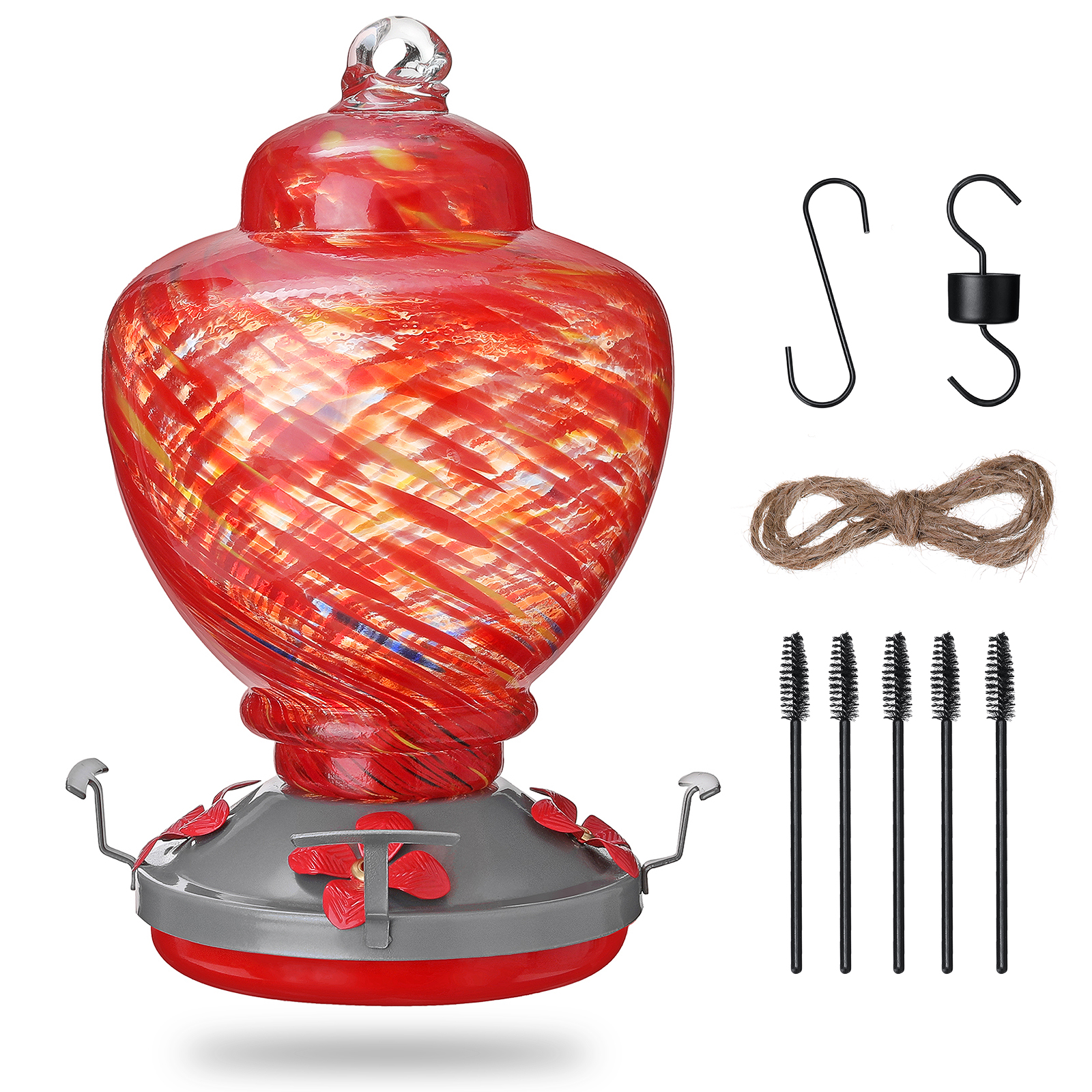 Red Glass Hummingbird Feeder Ant Proof Hook Stained Glass Feeder for Outdoors Patio with 2 Rubber Rings,4 Feeder Holes