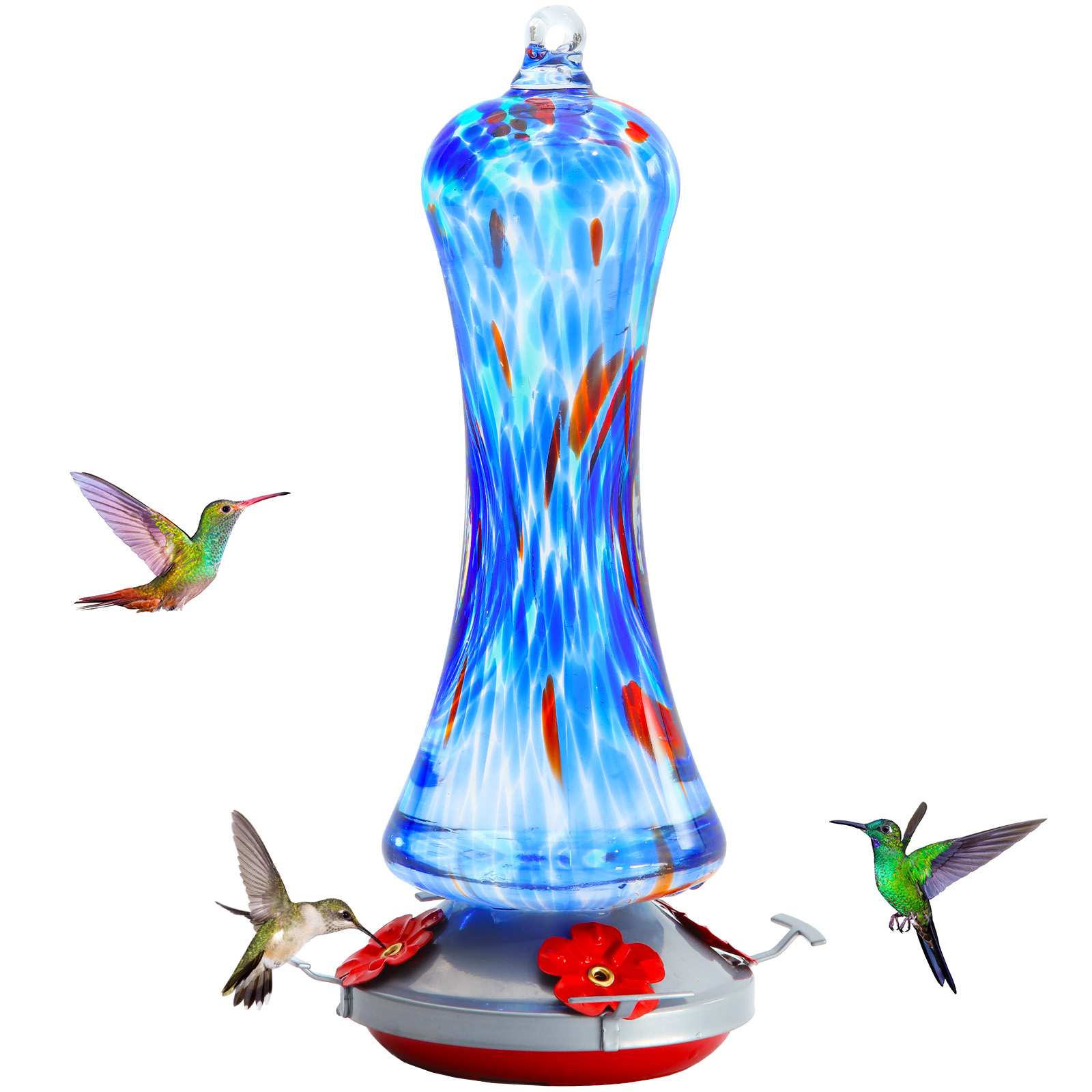 Birdkiss Hand-Blown Glass Hummingbird Feeder 16 oz for Garden Backyard Patio Decor with Ant Moat, Leak Proof & Rustproof, 5 Feeding Ports & 5 Perches