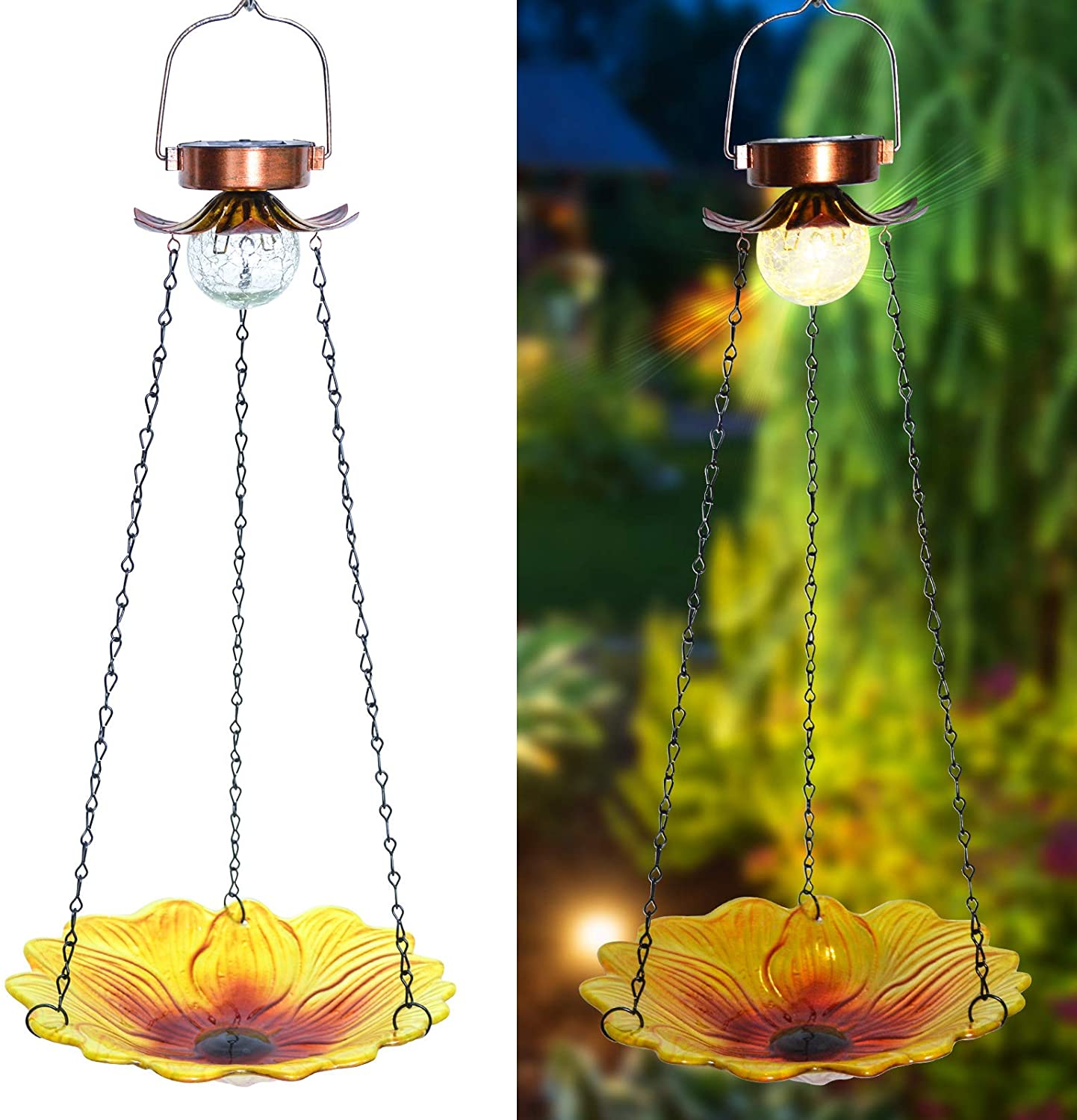 ALLADINBOX 24 Inch Solar Outdoor Decorations, Waterproof Hanging Bird Bath and Glass Bird Feeder Sunflower Tray Crackle Ball Light Decor for Yard Garden Patio