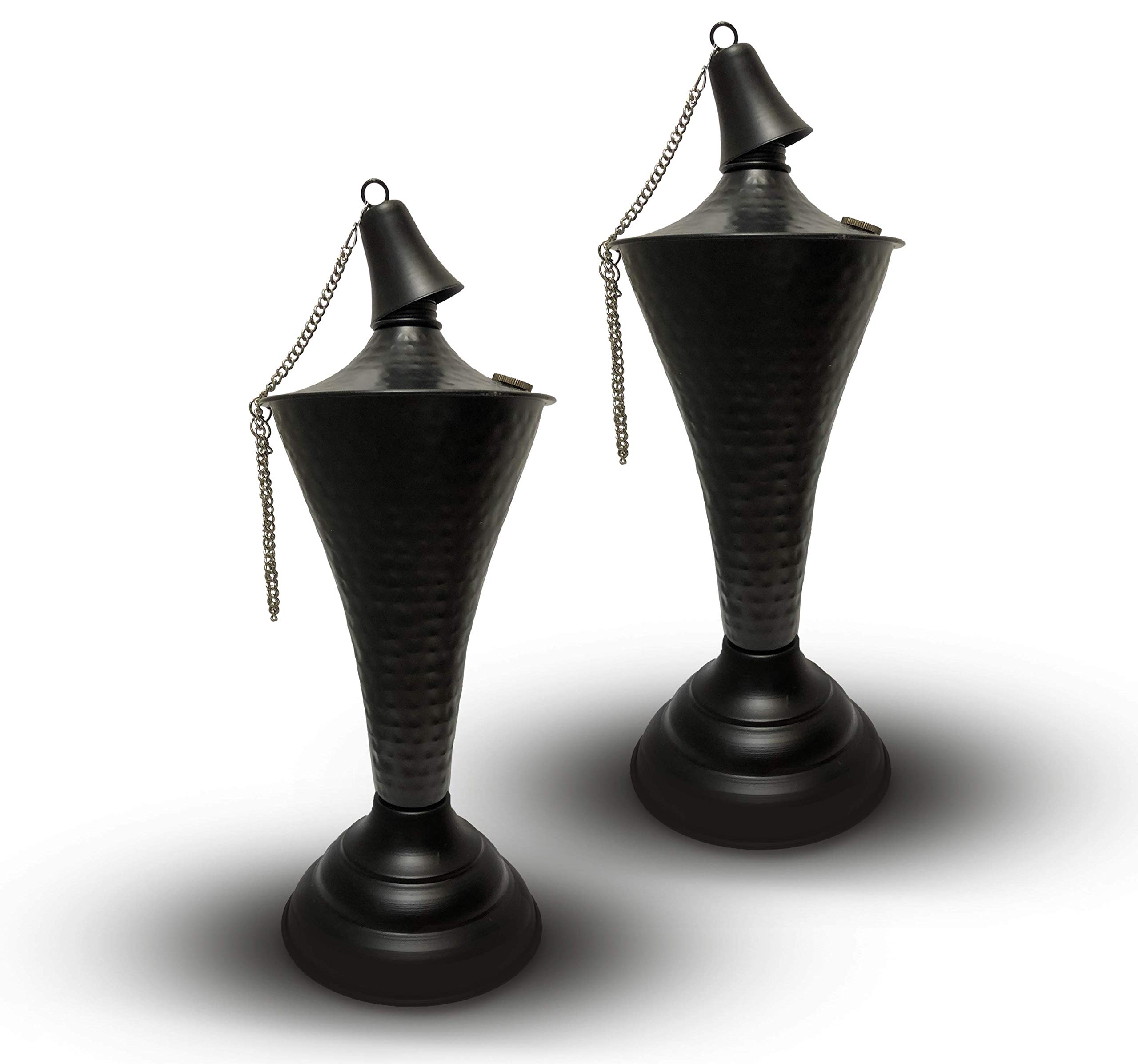 Legends Direct Set of 2, Premium Oahu Metal Tabletop Outdoor Torches for Patio, Lawn and Garden - Tiki Style Metal Torch /w Snuffer, Fiberglass Wick & Large 35oz Oil Lamp Tall (Hammered Black)