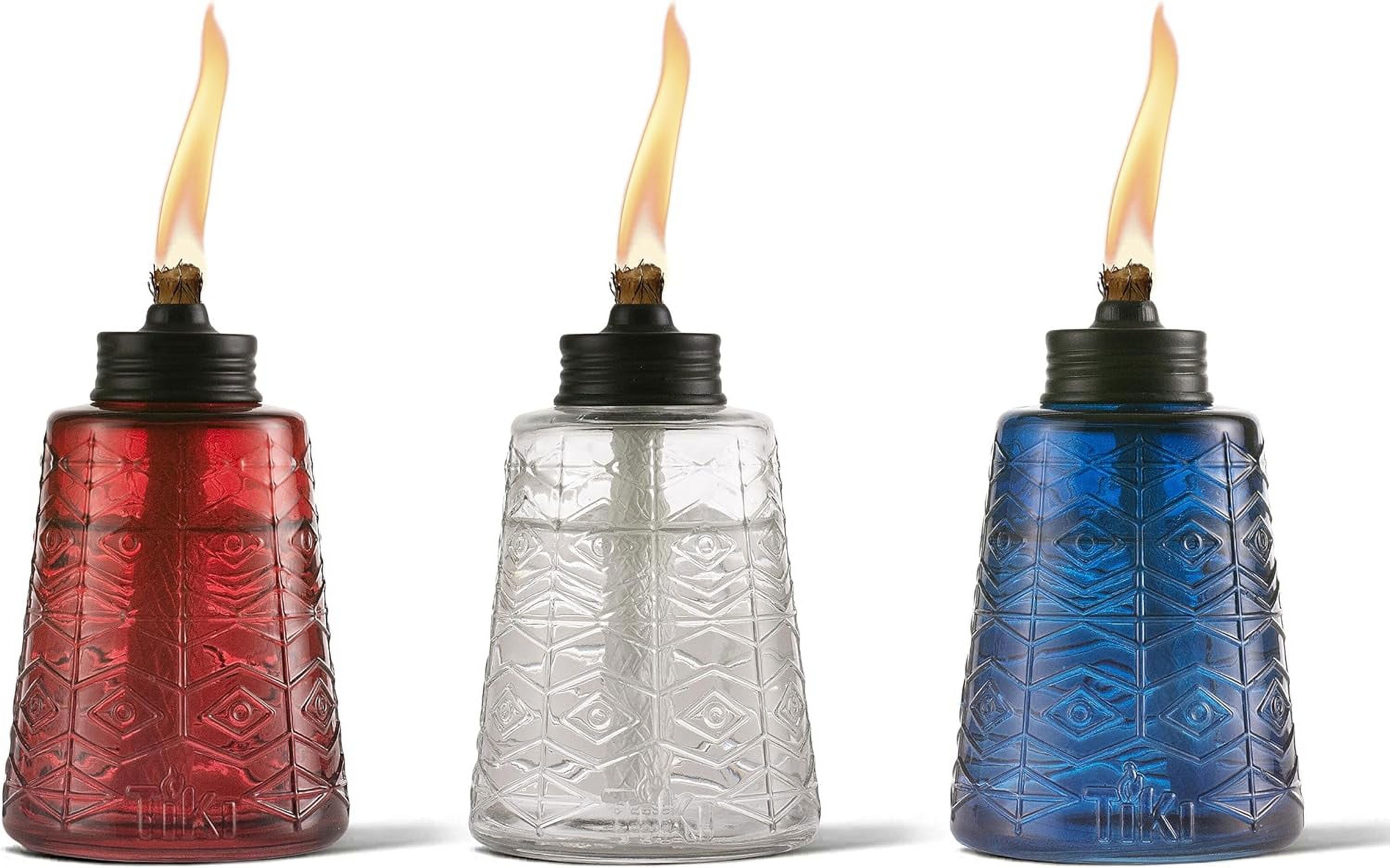 TIKI, Brand Molded Glass, Decorative Table Top Torch for Outdoor Lawn, Patio, and Garden White & Blue (Set of 3), 1117213, Red, White and Blue