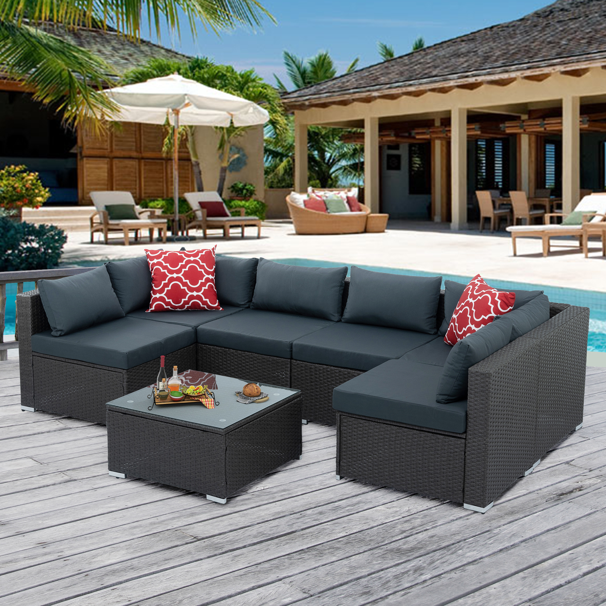 7 Piece Patio Furniture Sets Outdoor Sectional PE Rattan Outdoor Furniture Patio Conversation Set with Cushions and Glass Coffee Table, for Balcony Lawn and Garden, Dark Gray