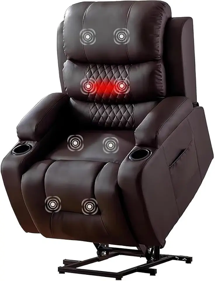 Electric Power Lift Brown Recliner Chair for Elderly Large Genuine Leather Power Lift Recliner Sofa with Massage and Heat for Living Room 2 Side Pockets, and Cup Holders, USB Ports