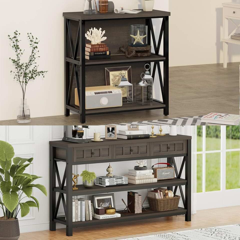 FATORRI Industrial Sofa Table with Drawers and Small Bookcase for Entryway (Walnut Brown)
