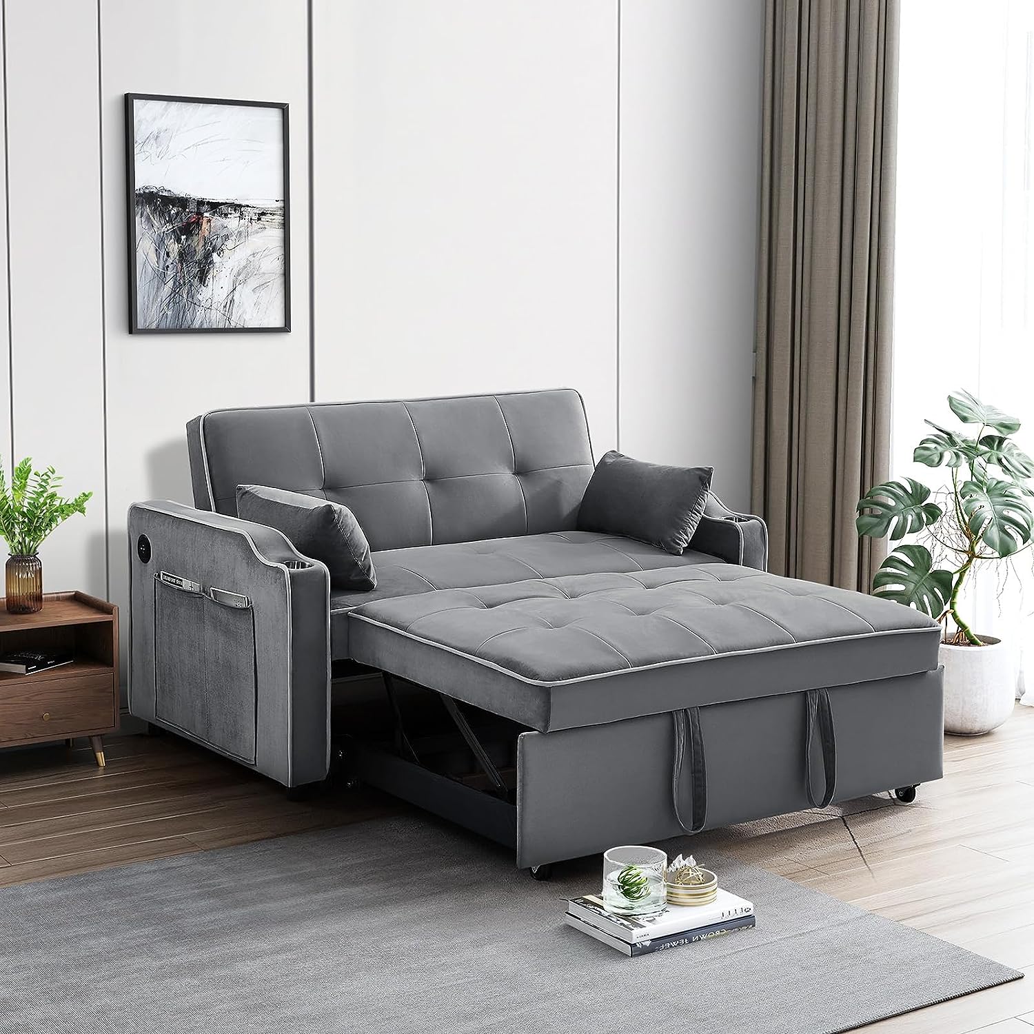 55" Convertible Sofa Bed, 3-in-1 Convertible Sleeper Couch, Pull Out Couch for Living Room, Multi-Functional Grey Velvet Loveseat Futon Bed with 2 Pillows and Storage Bags, Gray