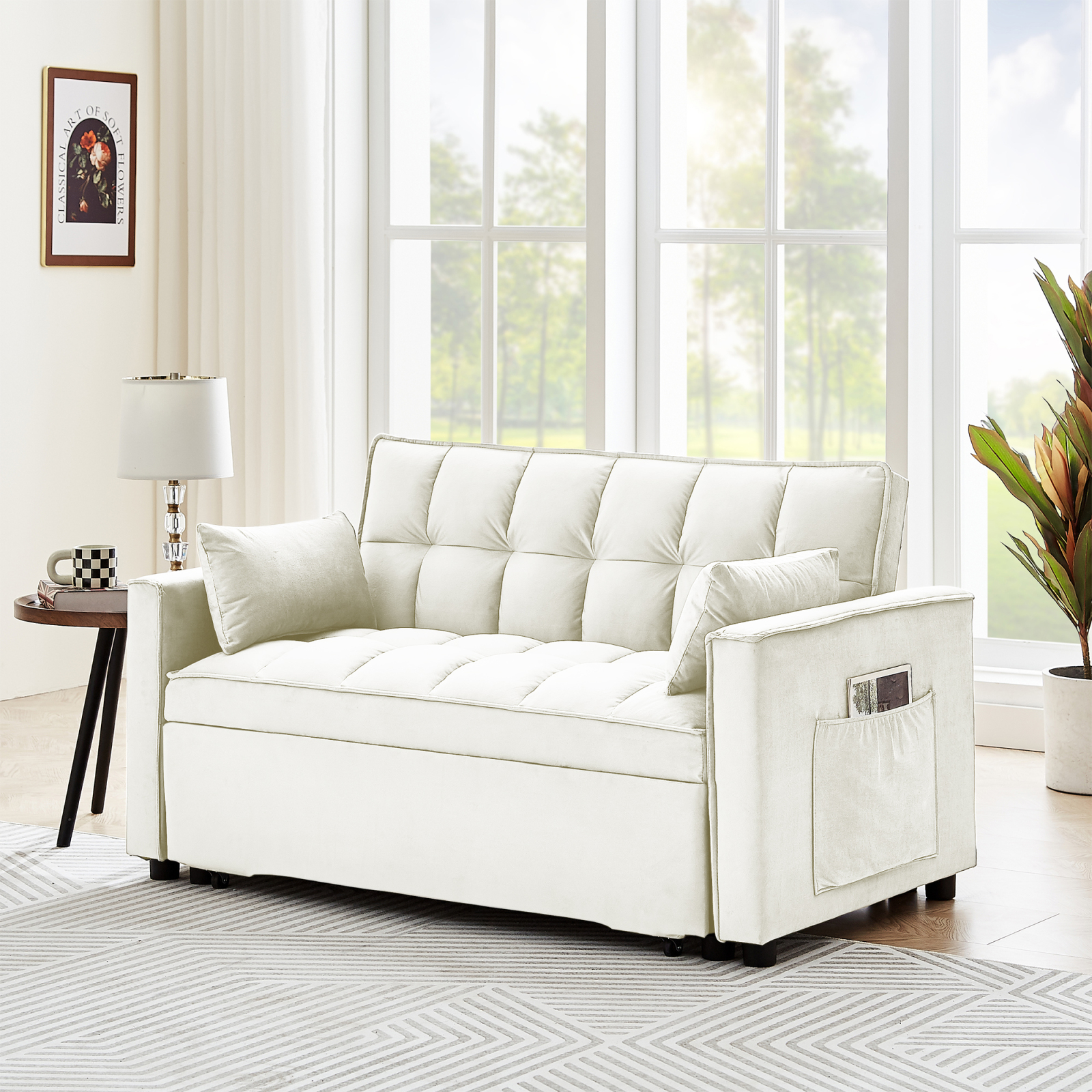 Miekor Sleeper Sofa Couch w/Pull Out Bed, 55" Modern Velvet Convertible Sleeper Sofa Bed, Small Love seat Sofa Bed w/Pillows & Side Pockets for Small Space, Living Room, Apartment, Cream White 27247