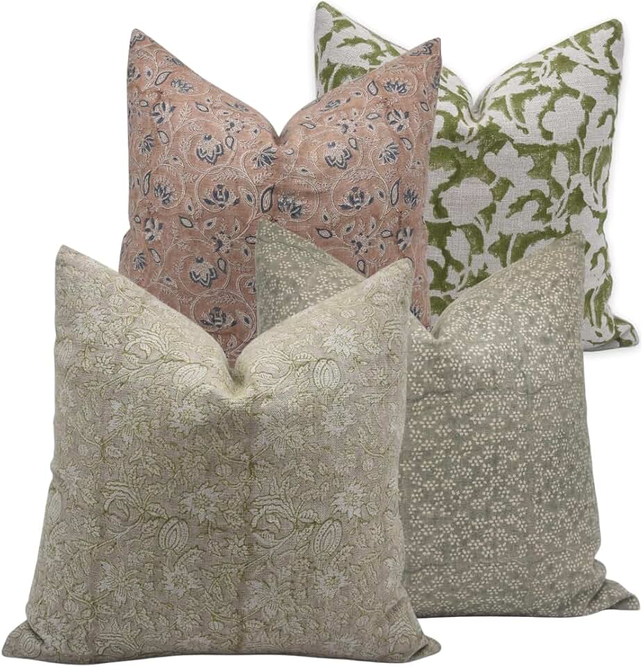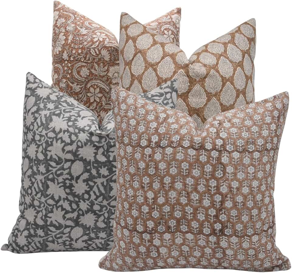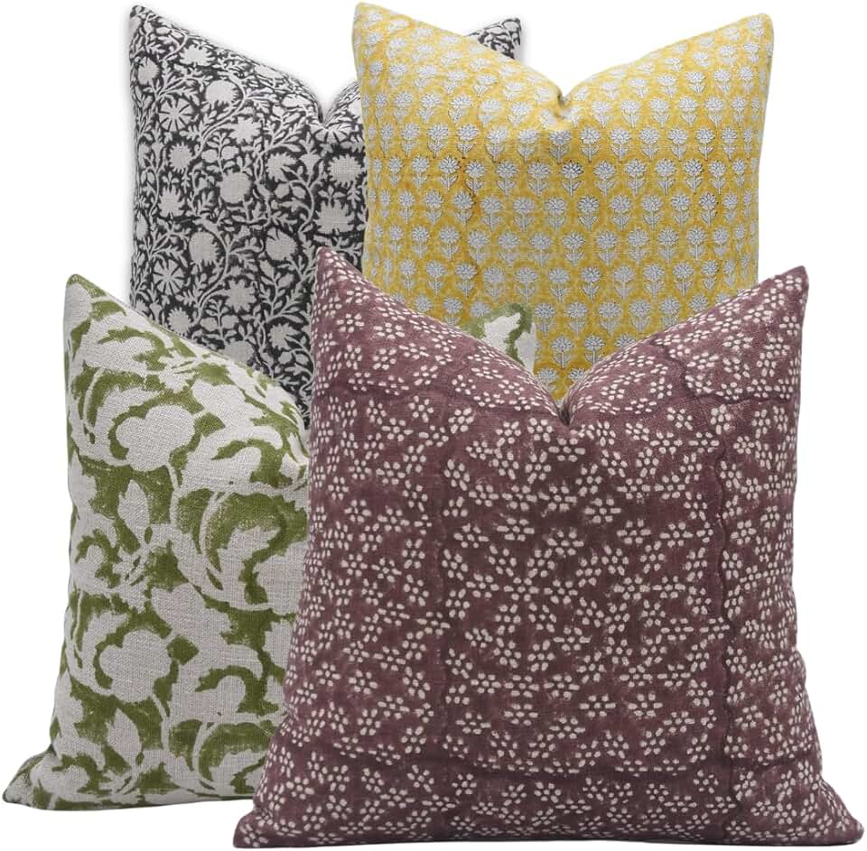 Combination Set of 4 (14"x14",18"x18",20"x20", 24"x24") Thick Linen Handmade Block Print Decorative Throw Pillowcase Cushion Covers for Room, Couch, Sofa, Bed, Farmhouse, All Season