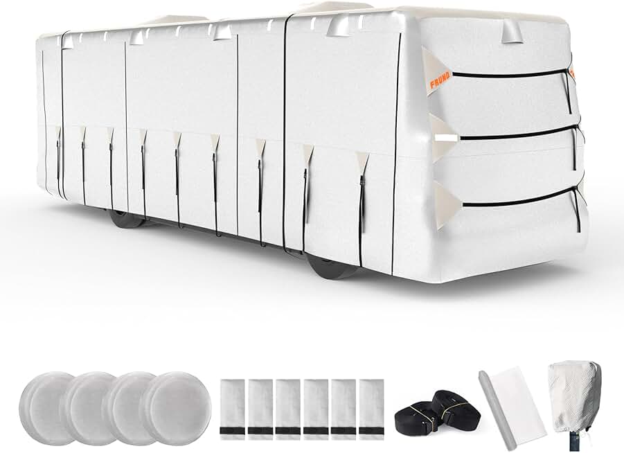 Oxford Cloth Class A RV Cover Fits 40'-43' Waterproof Rip-Resistant Anti-UV Motorhome Camper Cover for Winter Snow with Jack Cover 4 Tire Covers and Gutter Covers
