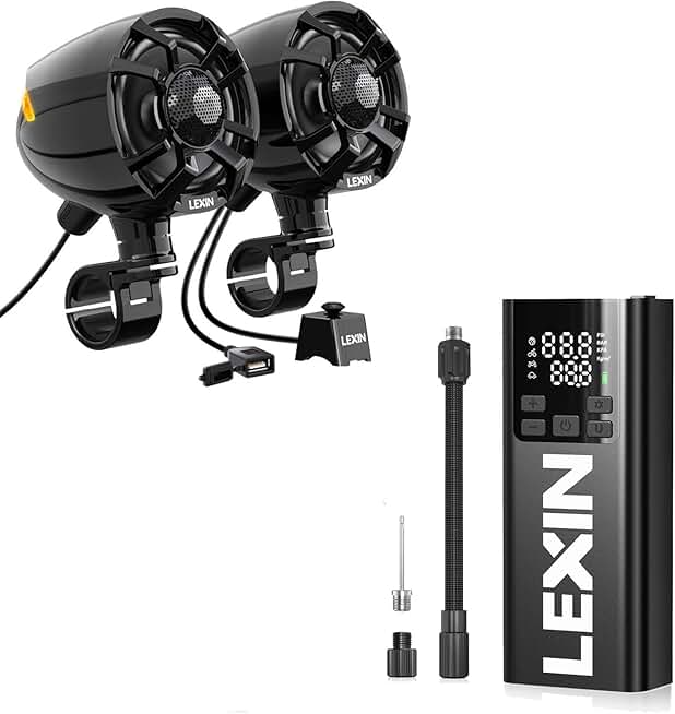 LEXIN S35 Motorcycle Speakers Bluetooth Waterproof, 200W Handlebar Stereo Audio Systems, 3.5" Full Range Speakers, FM Radio, LED Lights, Bundle P5 Tire Inflator Portable Air Compressor