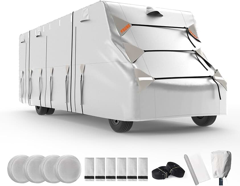 Oxford Cloth Class C RV Cover Fits 29'-32' Waterproof Rip-Resistant Anti-UV Motorhome Camper Cover for Winter Snow with Jack Cover 4 Tire Covers and Gutter Covers