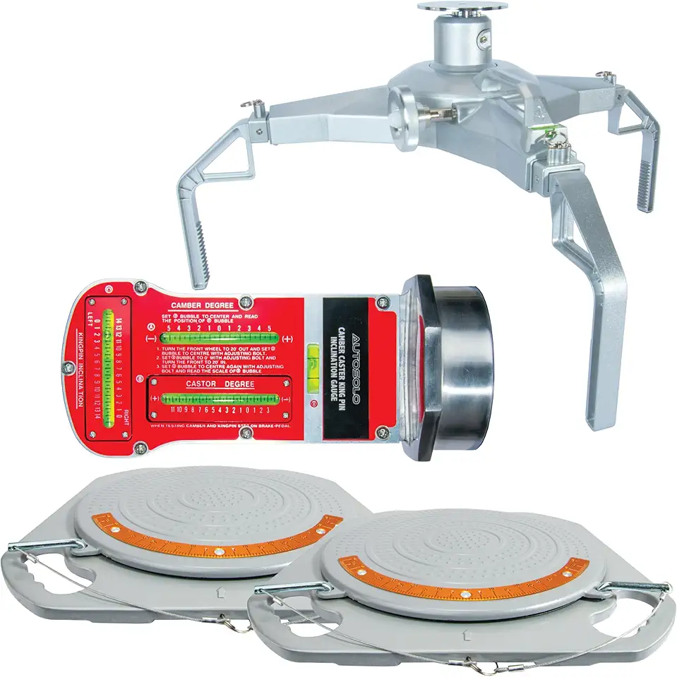 Complete Wheel Alignment Bundle: Tire Clamp with Magnetic Adapter, Low Profile Turn Plates & Camber/Castor Gauge - Professional Automotive Alignment Tools Set