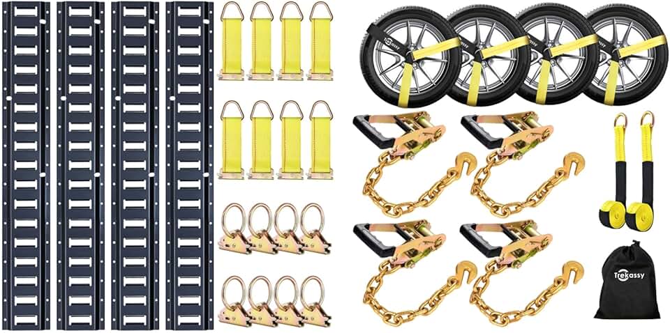 Trekassy 8ft E Track Tie-Down Rail Kit and 4 Pack 2" x 96" Tire Straps with Ratchet Bundle