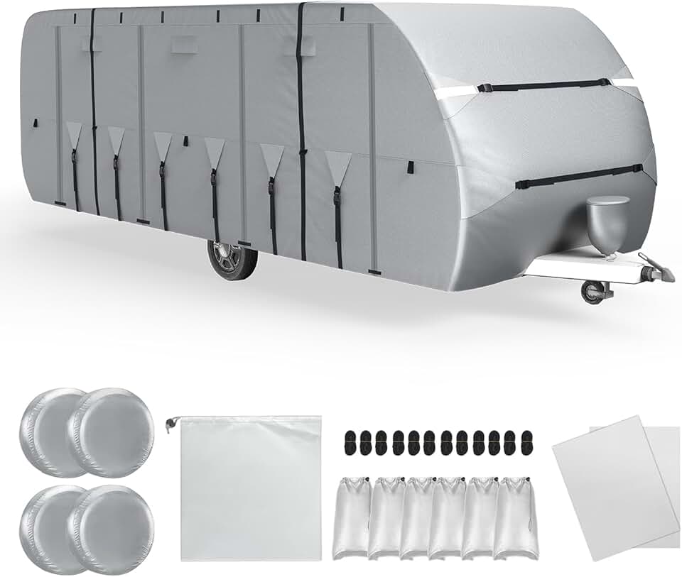 Fullwatt RV Cover Travel Trailer Cover 300D Oxford 27“-30” Camper Cover for Waterproof, Tear Resistant, UV Resistant, Windproof, Snowproof with Jack Cover, 4 Tire Covers and Gutter Cover