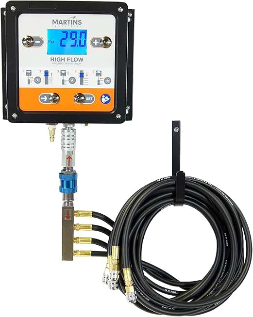 Martins 4 Outlets Automatic Tire Inflator/Deflator, 145 psi, 4 air Hoses of 8’, Inflate or Deflate up to 4 Tires simultaneously and Automatically. Orange.